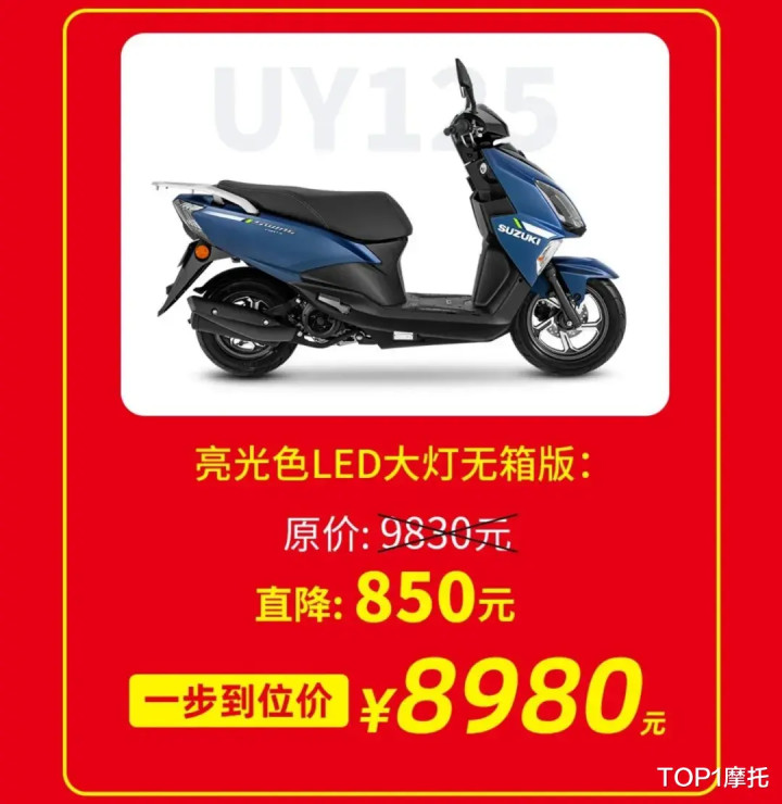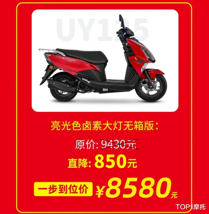 此次只有两个版本降价,卤素大灯无尾箱版,LED大灯无尾箱版,两个版本均下调了850元,卤素大灯无尾箱版现在8580元,LED大灯无尾箱版现在8980元。对于看惯了大排量车型动不动几千的降价,再看这种几百块的降价是不是完全没感觉,实际上这几百块很难影响到那些本来就准备买的用户。也没有办法将UY125的性价比在提升多少,小编到是觉得更像是在对内卷的市场致敬,证明自己也参与了。